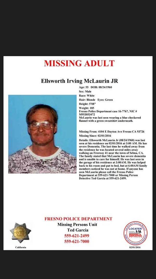 If anyone has seen McLaurin please call the Fresno Police Department at 559-621-7000 or Missing Person Detective Ted Garcia at 559-621-2499.