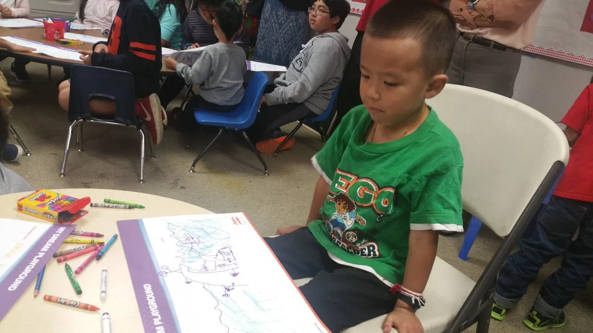 Kids from Fresno Interdenominational Refugee Ministries (FIRM) put crayons to paper to draw their dream playground, which will ultimately become a reality with help from Kaiser Permanente and organizers from national non-profit KaBOOM!