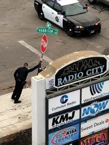 Aftermath of multi-vehicle crash right outside @KMJNOW @CumulusMedia studios at Shaw & Harrison. @CityofFresno is replacing sign ripped out after Porsche flew off Shaw into parking lot. pic.twitter.com/XPlhEeUkgU