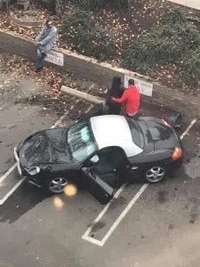 Scattered pieces of a black Porsche were in the parking lot outside of the Cumulus Media building.