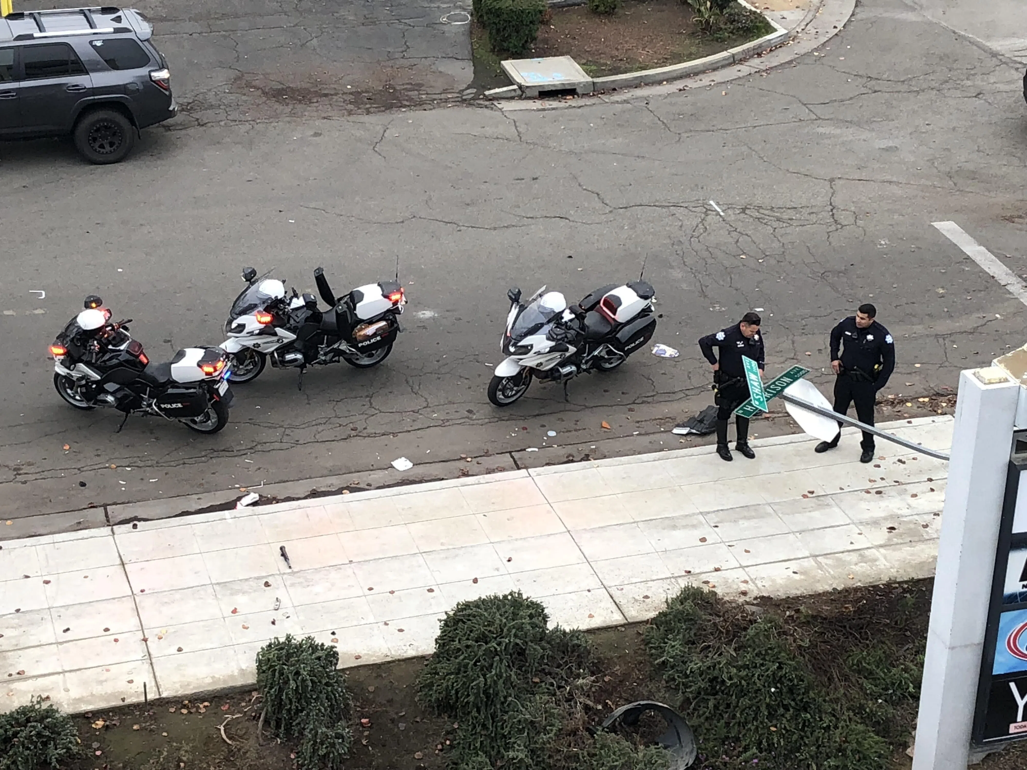 Fresno Police officers arrived on motorcycles and a Fresno County Sheriff’s SUV came shortly afterward to take down information from witnesses, and speak with the drivers.