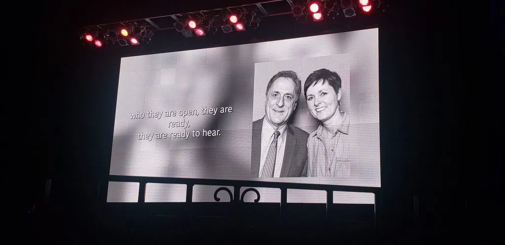 The final audio of the the service was of Spees, himself. The Warnor’s Theatre screen showed a photo of Spees and his daughter, Corrie, while the audio playing was H, describing how he got the most meaning acting in his role as pastor, while attending to the many funerals over the course of his life. Spees said it was during that time – even more so than at weddings – that family would come together and share stories of their departed loved ones and connect with each other on a deeper level. Stories of how they remembered ‘gramma making waffles in the kitchen’ and the sounds and smells. Spees called it a “divine appointment.”