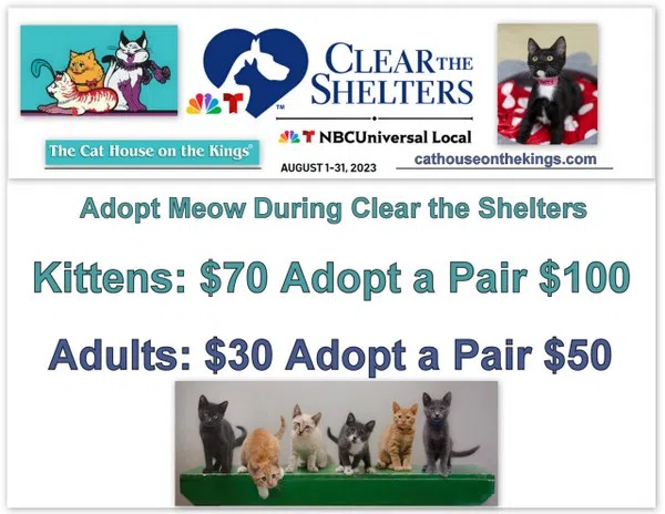 PARLIER, CA (KMJ) – The Cat House on the Kings is proud to participate in the 9th annual Clear the Shelters Adoption and Donation campaign.