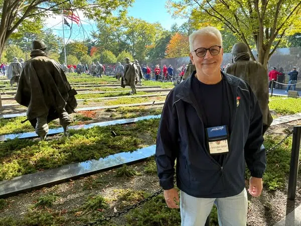 “Visiting the Korean War Veterans Memorial. We have a number of Korean War veterans with us on Central Valley Honor Flight. And as I’ve shared, my dad was a bombardier on a B-29 in Korea. He flew 30 missions. He made it back, but he never made it here. So I’m here for him.