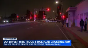 FRESNO, Calif. (KFSN) — Dramatic video in Fresno of a driver crashing into a pickup truck and a railroad crossing arm, just after 5 o’clock this evening.