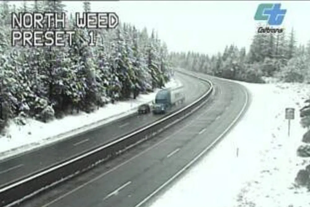 In this image taken from video from a Caltrans remote video traffic camera, light traffic makes its way in snowy conditions along Interstate 5 in Weed, Calif., Tuesday, Nov. 1, 2022. A potent cold fro...