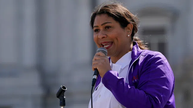 FILE – In this March 13, 2021, file photo, SF Mayor London Breed speaks at a rally. Anyone with information leading to the arrest and conviction of auto burglary ringleaders could receive a cash...